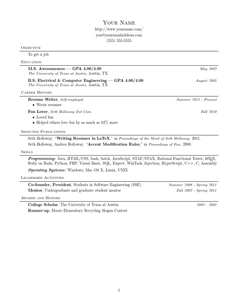 http://www.yourname.com/ you@youremailaddress.com (555) 555-5555 Objective To get a job Education M.S. Awesomeness GPA 4.00/4.00 The University of Texas at Austin, Austin, TX B.S. Electrical & Computer Engineering GPA 4.00/4.00 The University of Texas at Austin, Austin, TX Career History Resume Writer, Self-employed Wrote resumes Fun Lover, Seth Holloway Dot Com Loved fun Helped others love fun by as much as 82% more Selected Publications Seth Holloway. Writing Resumes in LaTeX, in Proceedings of the Mind of Seth Holloway. 2011. Seth Holloway, Andrea Holloway. Accent Modication Rules, in Proceedings of Fun. 2008. Skills