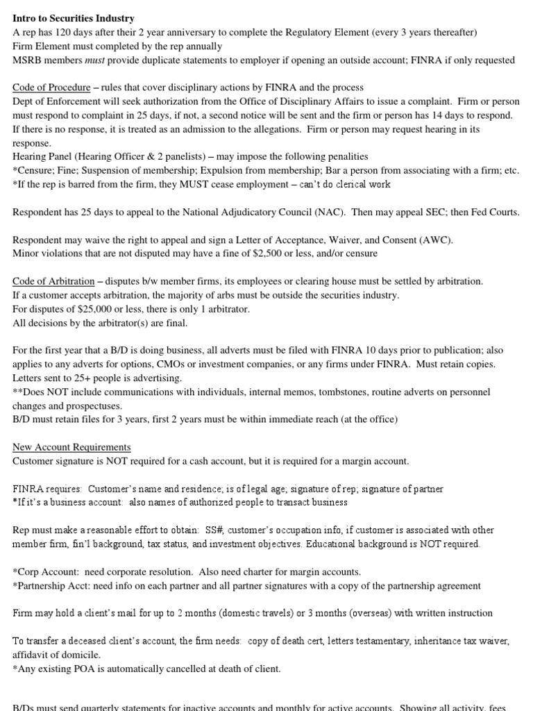 (every 3 years thereafter) Firm Element must completed by the rep annually MSRB members must provide duplicate statements to employer if opening an outside account; FINRA if only requested Code of Procedure rules that cover disciplinary actions by FINRA and the process Dept of Enforcement will seek authorization from the Office of Disciplinary Affairs to issue a complaint. Firm or person must respond to complaint in 25 days, if not, a second notice will be sent and the firm or person has 14 days to respond. If there is no response, it is treated as an admission to the allegations. Firm or person may request hearing in its response. Hearing Panel (Hearing Officer & 2 panelists) may impose the following penalities *Censure; Fine; Suspension of membership; Expulsion from membership; Bar a person from associating with a firm; etc. *If the rep is barred from the firm, they MUST cease employment cant do clerical work Respondent has 25 days to appeal to the National Adjudicatory Council (NAC). Then may appeal SEC; then Fed Courts. Respondent may waive the right to appeal and sign a Letter of Acceptance, Waiver, and Consent (AWC). Minor violations that are not disputed may have a fine of $2,500 or less, and/or censure Code of Arbitration disputes b/w member firms, its employees or clearing house must be settled by arbitration. If a customer accepts arbitration, the majority of arbs must be outside the securities industry. For disputes of $25,000 or less, there is only 1 arbitrator. All decisions by the arbitrator(s) are final. For the first year that a B/D is doing business, all adverts must be filed with FINRA 10 days prior to publication; also applies to any adverts for options, CMOs or investment companies, or any firms under FINRA. Must retain copies. Letters sent to 25+ people is advertising. **Does NOT include communications with individuals, internal memos, tombstones, routine adverts on personnel changes and prospectuses. B/D must retain files for 3 years, first 2 years must be within immediate reach (at the office) New Account Requirements Customer signature is NOT required for a cash account, but it is required for a margin account. FINRA requires: Customers name and residence; is of legal age; signature of rep; signature of partner *If its a business account: also names of authorized people to transact business Rep must make a reasonable effort to obtain: SS#, customers occupation info, if customer is associated with other member firm, finl background, tax status, and investment objectives. Educational background is NOT required. *Corp Account: need corporate resolution. Also need charter for margin accounts. *Partnership Acct: need info on each partner and all partner signatures with a copy of the partnership agreement Firm may hold a clients mail for up to 2 months (domestic travels) or 3 months (overseas) with written instruction To transfer a deceased clients account, the firm needs: copy of death cert, letters testamentary, inheritance tax waiver, affidavit of domicile. *Any existing POA is automatically cancelled at death of client.