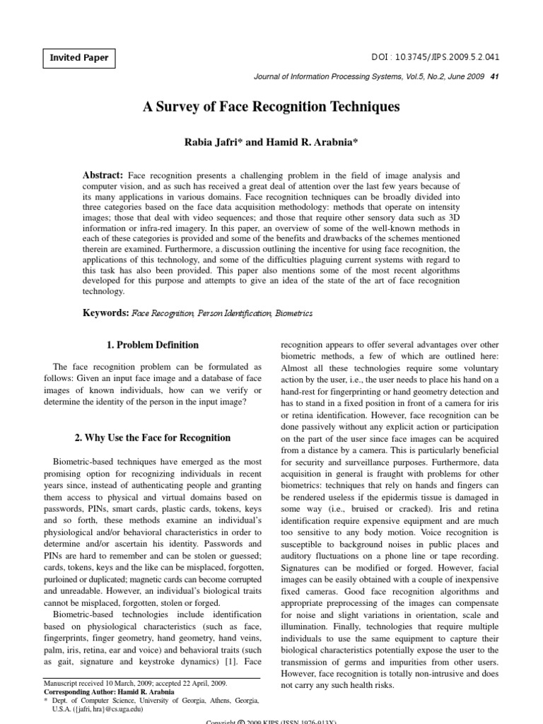 Face recognition is used for two primary tasks: 1. Verification (one-to-one matching): When presented with a face image of an unknown individual along with a claim of identity, ascertaining whether the individual is who he/she claims to be. 2. Identification (one-to-many matching): Given an image of an unknown individual, determining that persons identity by comparing (possibly after encoding) that image with a database of (possibly encoded) images of known individuals. There are numerous application areas in which face recognition can be exploited for these two purposes, a few of which are outlined below. Security (access control to buildings, airports/seaports, ATM machines and border checkpoints [2, 3]; computer/ network security [4]; email authentication on multimedia workstations). Surveillance (a large number of CCTVs can be monitored to look for known criminals, drug offenders, etc. and authorities can be notified when one is located; for example, this procedure was used at the Super Bowl 2001 game at Tampa, Florida [5]; in another instance, according to a CNN report, two cameras linked to state and national databases of sex offenders, missing children and alleged abductors have been installed recently at Royal Palm Middle School in Phoenix, Arizona [6]). General identity verification (electoral registration, banking, electronic commerce, identifying newborns, national IDs, passports, drivers licenses, employee IDs). Criminal justice systems (mug-shot/booking systems, post-event analysis, forensics). Image database investigations (searching image databases of licensed drivers, benefit recipients, missing children, immigrants and police bookings). Smart Card applications (in lieu of maintaining a database of facial images, the face-print can be stored in a smart card, bar code or magnetic stripe, authentication of which is performed by matching the live image and the stored template) [7]. Multi-media environments with adaptive humancomputer interfaces (part of ubiquitous or contextaware systems, behavior monitoring at childcare or old peoples centers, recognizing a customer and assessing his needs) [8, 9]. Video indexing (labeling faces in video) [10, 11]. Witness face reconstruction [12]. In addition to these applications, the underlying techniques in the current face recognition technology have also been
