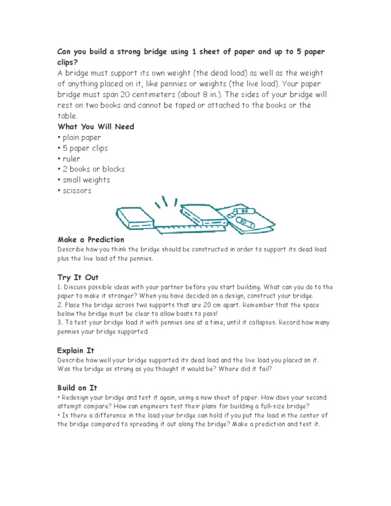 A bridge must support its own weight (the dead load) as well as the weight of anything placed on it, like pennies or weights (the live load). Your paper bridge must span 20 centimeters (about 8 in.). The sides of your bridge will rest on two books and cannot be taped or attached to the books or the table. What You Will Need plain paper 5 paper clips ruler 2 books or blocks small weights scissors
