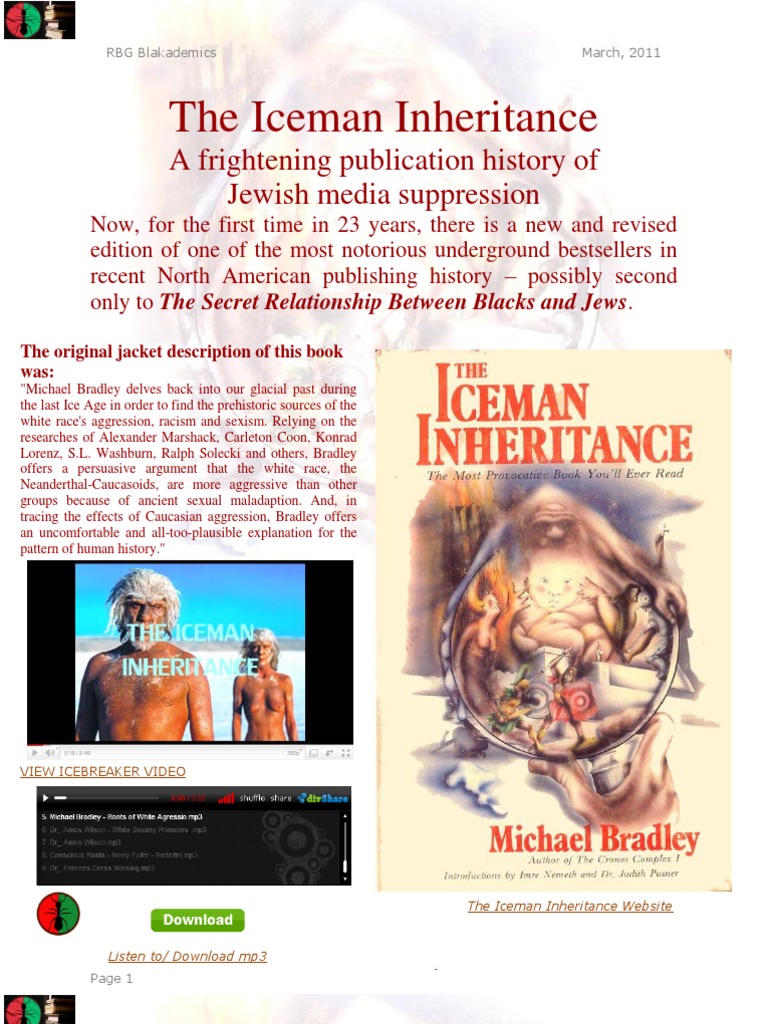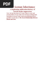 after all, the Florida vote turned out to be close in spite of the medias mistake. Three former Clinton aides also testified to the Senate that several network newscasters pestered outgoing Bill Clinton for presidential pardons during the last days of the Clinton-Gore Administration. Media buried these admissions on back pages when they were mentioned in print at all. No network television news or public affairs program ever even mentioned these pleas for presidential pardons by their own newscasters. There is much more to this attempted Election 2000 coup dtat for that is exactly what it was in the United States by Jews, the media and Israel. Thanks to some Afro-American contacts in the offices of the National Security Advisor and State Department, I have heard rumors about how and why the GoreLieberman ticket really backed down. Votes and recounts had little to do with it. But enough has been said to show that inordinate Jewish control of media is obviously dangerous for democracy. And Jewish control of North American media is also why you will never see a recap of Israels creation, as informative background to Middle East violence, on American television. To get back to my own story and The Iceman Inheritance, I was shocked and hurt by the New York Times editorial of July 20, 1992, but I was also very puzzled. What had I written to cause all this insane anger? My original Canadian publisher, Larry Goldstein of Dorset Publishing Inc., was not only Jewish, but had served in the