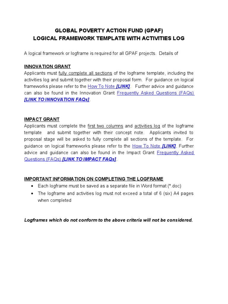A logical framework or logframe is required for all GPAF projects. Details of INNOVATION GRANT Applicants must fully complete all sections of the logframe template, including the activities log and submit together with their proposal form. For guidance on logical frameworks please refer to the How To Note [LINK]. Further advice and guidance can also be found in the Innovation Grant Frequently Asked Questions (FAQs) [LINK TO INNOVATION FAQs].