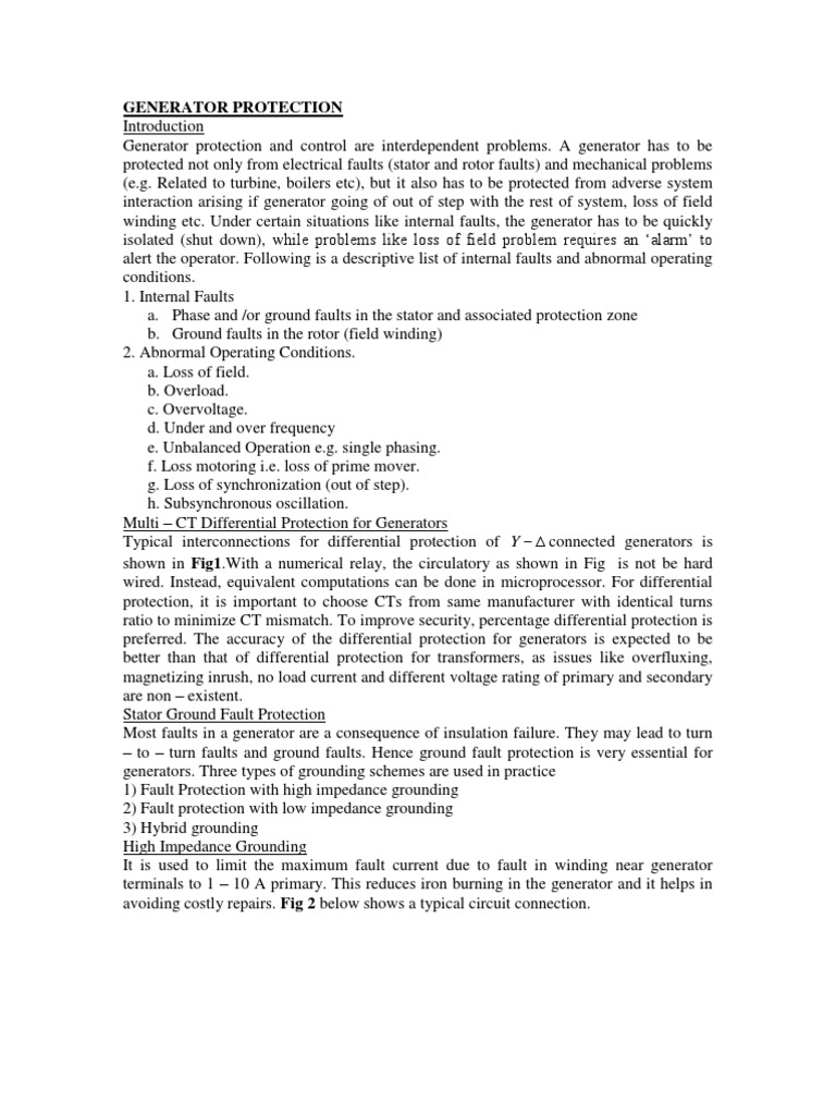 A generator has to be protected not only from electrical faults (stator and rotor faults) and mechanical problems (e.g. Related to turbine, boilers etc), but it also has to be protected from adverse system interaction arising if generator going of out of step with the rest of system, loss of field winding etc. Under certain situations like internal faults, the generator has to be quickly isolated (shut down), while problems like loss of field problem requires an alarm to alert the operator. Following is a descriptive list of internal faults and abnormal operating conditions. 1. Internal Faults a. Phase and /or ground faults in the stator and associated protection zone b. Ground faults in the rotor (field winding) 2. Abnormal Operating Conditions. a. Loss of field. b. Overload. c. Overvoltage. d. Under and over frequency e. Unbalanced Operation e.g. single phasing. f. Loss motoring i.e. loss of prime mover. g. Loss of synchronization (out of step). h. Subsynchronous oscillation. Multi CT Differential Protection for Generators Typical interconnections for differential protection of Y connected generators is shown in [Link] a numerical relay, the circulatory as shown in Fig is not be hard wired. Instead, equivalent computations can be done in microprocessor. For differential protection, it is important to choose CTs from same manufacturer with identical turns ratio to minimize CT mismatch. To improve security, percentage differential protection is preferred. The accuracy of the differential protection for generators is expected to be better than that of differential protection for transformers, as issues like overfluxing, magnetizing inrush, no load current and different voltage rating of primary and secondary are non existent. Stator Ground Fault Protection Most faults in a generator are a consequence of insulation failure. They may lead to turn to turn faults and ground faults. Hence ground fault protection is very essential for generators. Three types of grounding schemes are used in practice 1) Fault Protection with high impedance grounding 2) Fault protection with low impedance grounding 3) Hybrid grounding High Impedance Grounding It is used to limit the maximum fault current due to fault in winding near generator terminals to 1 10 A primary. This reduces iron burning in the generator and it helps in avoiding costly repairs. Fig 2 below shows a typical circuit connection.