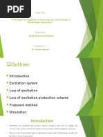Reduced or Loss of Excitation Protection What is it? Reduction or loss of excitation to the field winding is an abnormality rather than a fault. If the field winding is completely lost, then in principle, synchronous generator will try to mimic an induction generator. This mode of operation is possible provided that power system to which generator is connected is strong enough to provide necessary reactive power support. Recall that an induction generator has no field winding and hence it cannot generate reactive power. If adequate reactive power support is not available (a strong possibility!), then the generator will have to be shut down. It is likely that field winding will be accidentally shut off and usually loss of synchronism will require appreciable time to take effect. Hence, it is preferable to first raise an alarm for operator to restore field, failing which, generator has to be shut down. Consequences Prima-facie, consequence of reduced excitation may not appear to be dramatic, but it can lead to end-region over-heating in turbo-alternators. Hence, this abnormality has to be detected and an alarm has to be raised for the operator. The ultimate measure would be to shut down the generator. Fig xy shows the reactive power capability curve of a generator. It can be seen that in the lagging power factor-operating region, limits are determined either by rotor field heating limit or by stator armature heating limit. During the leading power factor-operating region, it is the iron end region-heating limit due to eddy currents that is detrimental to the machine. Turbo-alternators may not have adequate reactive power absorption capability. Hence, they are seldom operated with leading power factor. Typically leading power factor operation of generators results when the field excitation is reduced. Hence, limitations on the reactive power absorption capability set a lower limit on the reduction on field excitation system (see dotted line in figure xx). How? Protection system for synchronous-generators should detect reduced or loss of excitation condition, raise an alarm and if the abnormality persists, trip the generator. This can be achieved by use of distance relays that are installed at generator terminals. Directionally, they look into the generator. For this purpose, we need to interpret capability curve on the R-X plane. If the complex power generated is given by P jQ then the apparent impedance seen by the distance relay installed on the generator terminals is given by | V |2 | V |2 Zapp ( P jQ ) ----------- (1) P jQ P 2 Q 2 For simplicity, we have referred impedance has been referred to the primary side. Fig yy shows the capability curve transferred to R-X plane using eqn. (1). To protect the generator two distance relays and directional units are used. To protect generator against complete loss of field, inner circle is used. The relay operates when the impedance vector moves into this circle. Operating time of about 0.2 to 0.3 seconds are used with a complete shut down of the generator. The diameter of this circle is of the ' order of X d , with the upper part of the circle 50-75% of X d below the origin. The larger circle is used to detect reduced or partial loss of excitation system. Directional blinder may be used to limit pickup on normal operating condition.
