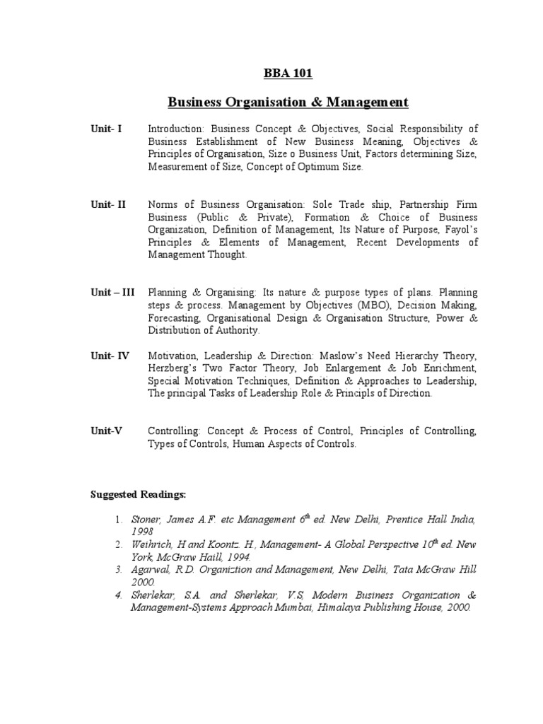 Suggested Readings: 1. Stoner, James A.F. etc Management 6th ed. New Delhi, Prentice Hall India, 1998 2. Weihrich, H and Koontz. H., Management- A Global Perspective 10th ed. New York, McGraw Haill, 1994. 3. Agarwal, R.D. Organiztion and Management, New Delhi, Tata McGraw Hill 2000. 4. Sherlekar, S.A. and Sherlekar, V.S, Modern Business Organization & Management-Systems Approach Mumbai, Himalaya Publishing House, 2000.