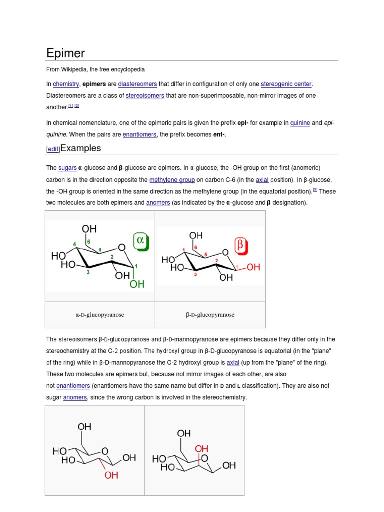 The sugars -glucose and -glucose are epimers. In -glucose, the -OH group on the first (anomeric) carbon is in the direction opposite the methylene group on carbon C-6 (in the axial position). In -glucose, the -OH group is oriented in the same direction as the methylene group (in the equatorial position). [3] These two molecules are both epimers and anomers (as indicated by the -glucose and designation).