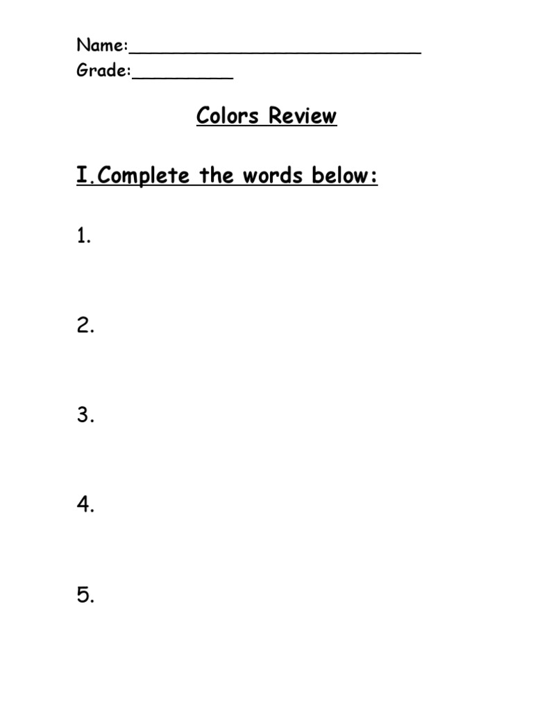 Colors Review: Name: - Grade