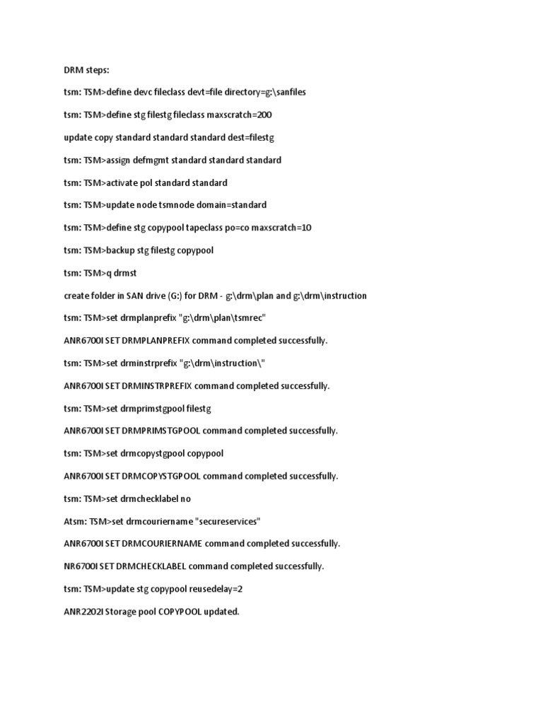 copy standard standard standard dest=filestg tsm: TSM>assign defmgmt standard standard standard tsm: TSM>activate pol standard standard tsm: TSM>update node tsmnode domain=standard tsm: TSM>define stg copypool tapeclass po=co maxscratch=10 tsm: TSM>backup stg filestg copypool tsm: TSM>q drmst create folder in SAN drive (G:) for DRM - g:\drm\plan and g:\drm\instruction tsm: TSM>set drmplanprefix "g:\drm\plan\tsmrec" ANR6700I SET DRMPLANPREFIX command completed successfully. tsm: TSM>set drminstrprefix "g:\drm\instruction\" ANR6700I SET DRMINSTRPREFIX command completed successfully. tsm: TSM>set drmprimstgpool filestg ANR6700I SET DRMPRIMSTGPOOL command completed successfully. tsm: TSM>set drmcopystgpool copypool ANR6700I SET DRMCOPYSTGPOOL command completed successfully. tsm: TSM>set drmchecklabel no Atsm: TSM>set drmcouriername "secureservices" ANR6700I SET DRMCOURIERNAME command completed successfully. NR6700I SET DRMCHECKLABEL command completed successfully. tsm: TSM>update stg copypool reusedelay=2 ANR2202I Storage pool COPYPOOL updated.