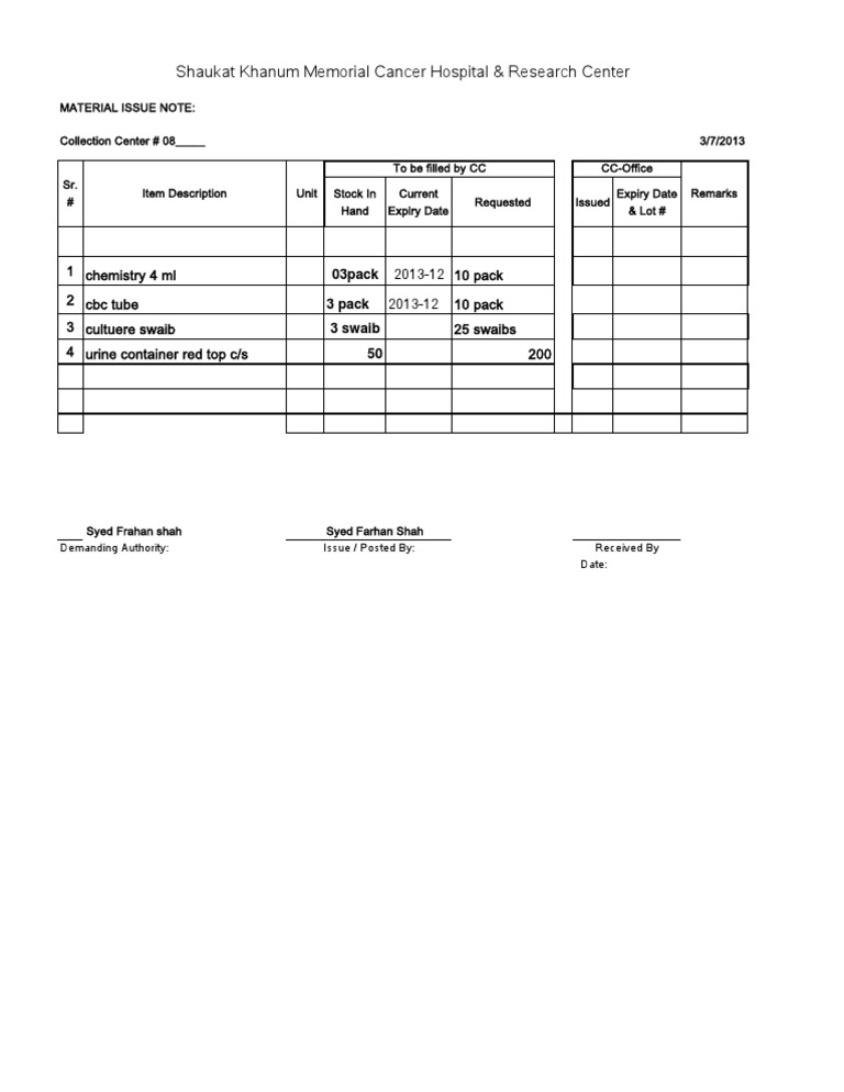MATERIAL ISSUE NOTE: Collection Center # 08_____ To be filled by CC Sr. # Item Description Unit Stock In Hand Current Expiry Date Requested CC-Office Issued Expiry Date & Lot # Remarks 3/7/2013