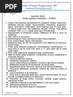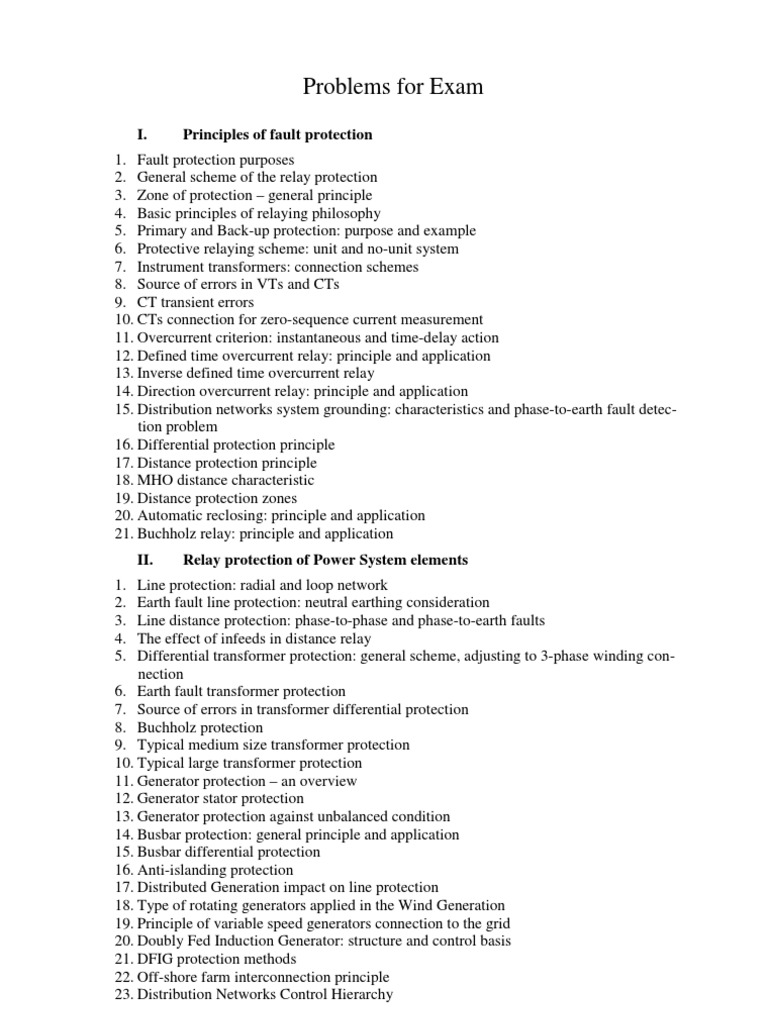 I. Principles of fault protection 1. Fault protection purposes 2. General scheme of the relay protection 3. Zone of protection general principle 4. Basic principles of relaying philosophy 5. Primary and Back-up protection: purpose and example 6. Protective relaying scheme: unit and no-unit system 7. Instrument transformers: connection schemes 8. Source of errors in VTs and CTs 9. CT transient errors 10. CTs connection for zero-sequence current measurement 11. Overcurrent criterion: instantaneous and time-delay action 12. Defined time overcurrent relay: principle and application 13. Inverse defined time overcurrent relay 14. Direction overcurrent relay: principle and application 15. Distribution networks system grounding: characteristics and phase-to-earth fault detection problem 16. Differential protection principle 17. Distance protection principle 18. MHO distance characteristic 19. Distance protection zones 20. Automatic reclosing: principle and application 21. Buchholz relay: principle and application II. 1. 2. 3. 4. 5. Relay protection of Power System elements Line protection: radial and loop network Earth fault line protection: neutral earthing consideration Line distance protection: phase-to-phase and phase-to-earth faults The effect of infeeds in distance relay Differential transformer protection: general scheme, adjusting to 3-phase winding connection 6. Earth fault transformer protection 7. Source of errors in transformer differential protection 8. Buchholz protection 9. Typical medium size transformer protection 10. Typical large transformer protection 11. Generator protection an overview 12. Generator stator protection 13. Generator protection against unbalanced condition 14. Busbar protection: general principle and application 15. Busbar differential protection 16. Anti-islanding protection 17. Distributed Generation impact on line protection 18. Type of rotating generators applied in the Wind Generation 19. Principle of variable speed generators connection to the grid 20. Doubly Fed Induction Generator: structure and control basis 21. DFIG protection methods 22. Off-shore farm interconnection principle 23. Distribution Networks Control Hierarchy