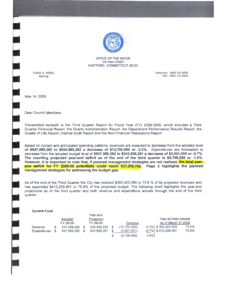 Revenues are expected to decrease from the adopted level of $547,589,282 to $534,889,282, a decrease of $12,700,000 or -2.3%. The resulting projected year-end deficit as of the end of the Third Quarter is $8,798,999 or -1.6%. The total yearend deficit for FY 2008-09 potentially could reach $27,205,792.