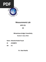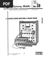 Similarly, the voltage at the right terminal (labelled "-") is given by: Vtop. [Rs/(Rc + Rs)] The difference between these two voltages - the output voltage - is given by: Vtop. [Rb/(Ra + Rb)] - Vtop. [Rs/ (Rc + Rs)] Setting the output voltage to zero (the condition for a balanced bridge), we get: Vtop. [Rb/(Ra + Rb)] - Vtop. [Rs/(Rc + Rs)] = 0 Since Vtop is a common factor it can be removed. Then, we get: [Rb/(Ra + Rb)] - [Rs/(Rc + Rs)] = 0 or [Rb/(Ra + Rb)] = [Rs/(Rc + Rs)] Now, cross-multiply the denominators. RbRc + RbRs= RsRa + RbRs Note that the term RsRb appears on both sides of the equation and can be taken out on both sides. That gives us: RbRc = RsRa This is the condition for balance that we were looking for. It is a very simple relationship that must be obeyed by the resistors in the bridge portion of the circuit.