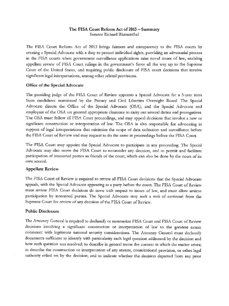 U.S. Senator Tom Udall (D-N.M.) - joined by Senators Richard Blumenthal (D-Conn.) and Ron Wyden (D-Ore.) -- unveils two bills that would ensure FISA courts properly balance the need to protect national security with constitutional and statutory requirements to safeguard individual rights to privacy and liberty. This bill – the FISA Court Reform Act of 2013 – would create a Special Advocate with the power to argue in the FISA courts on behalf of the right to privacy and other individual rights of the American people.