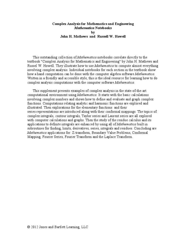 This outstanding collection of Mathematica notebooks correlate directly to the textbook "Complex Analysis for Mathematics and Engineering" by John H. Mathews and Russel W. Howell. They illustrate how to use Mathematica to compute almost everything involving complex analysis. Individual notebooks for each section in the textbook show how a hand computation can be done with the computer algebra software Mathematica. Written in a friendly and accessible style, this is the ideal resource for learning how to do complex analysis computations with the computer software Mathematica. This supplement presents examples of complex analysis in the state-of-the-art computational environment using Mathematica. It starts with the basic calculations involving complex numbers and shows how to define and evaluate and graph complex functions. Computations relating analytic and harmonic functions are explored and illustrated. Then explorations for the elementary functions and their series representations are introduced along with their conformal mappings. The topics of: complex integrals, contour integrals, Taylor series and Laurent series are all explored with computer calculations and graphs. Then the study of the residue calculus and its applications to definite integrals are enhanced by using all of Mathematica built in subroutines for finding, limits, derivatives, series, integrals and residues. Concluding are Mathematica applications for: Z-transform, Boundary Value Problems, Conformal Mapping, Fourier Series, Fourier Transform and the Laplace Transform.