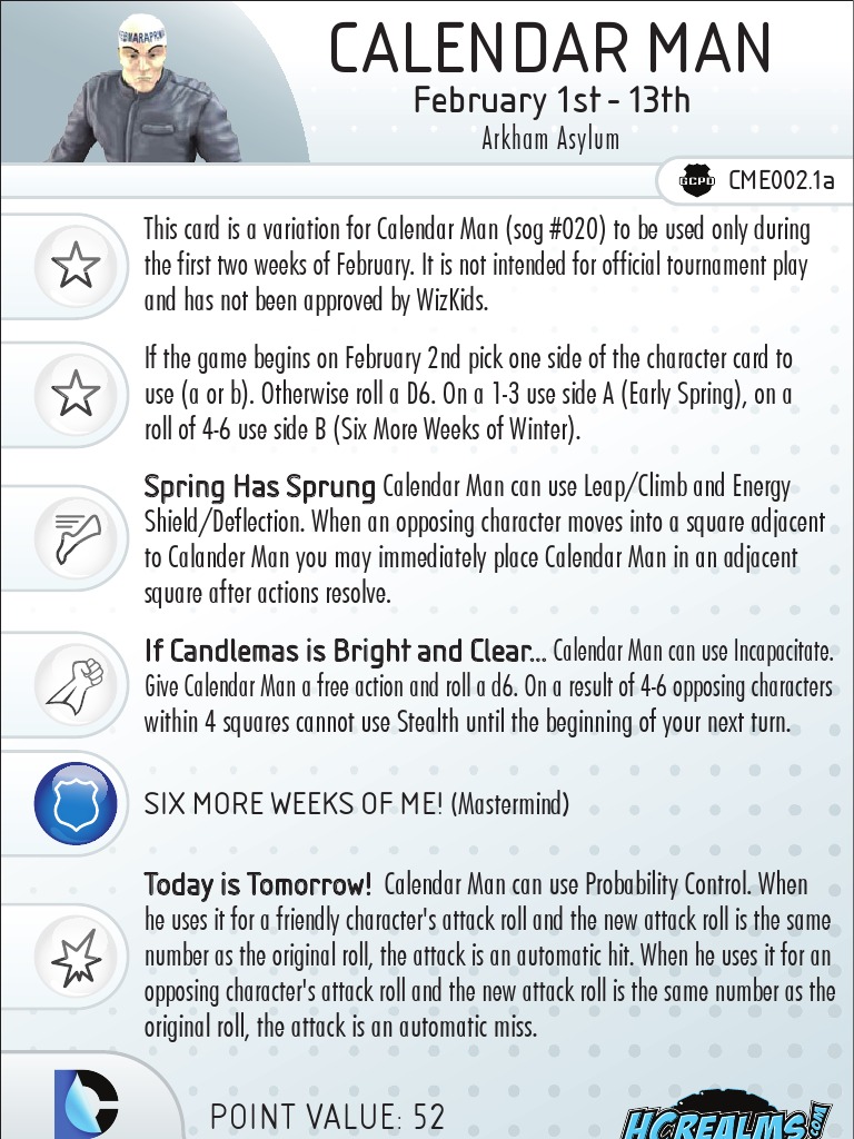 This card is a variation for Calendar Man (sog #020) to be used only during the first two weeks of February. It is not intended for official tournament play and has not been approved by WizKids. If the game begins on February 2nd pick one side of the character card to use (a or b). Otherwise roll a D6. On a 1-3 use side A (Early Spring), on a roll of 4-6 use side B (Six More Weeks of Winter). Spring Has Sprung Calendar Man can use Leap/Climb and Energy Shield/Deflection. When an opposing character moves into a square adjacent to Calander Man you may immediately place Calendar Man in an adjacent square after actions resolve. If Candlemas is Bright and Clear... Calendar Man can use Incapacitate. Give Calendar Man a free action and roll a d6. On a result of 4-6 opposing characters within 4 squares cannot use Stealth until the beginning of your next turn. SIX MORE WEEKS OF ME! (Mastermind) Today is Tomorrow! Calendar Man can use Probability Control. When he uses it for a friendly character's attack roll and the new attack roll is the same number as the original roll, the attack is an automatic hit. When he uses it for an opposing character's attack roll and the new attack roll is the same number as the original roll, the attack is an automatic miss.