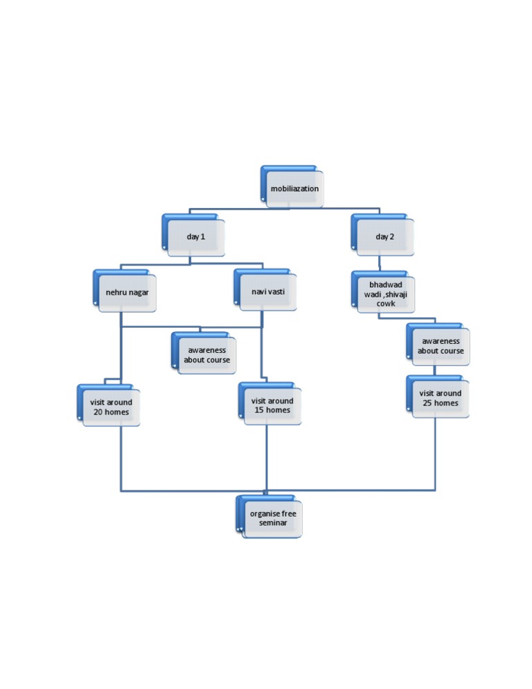 A mobilization effort visited homes over 3 days in 5 different areas to raise awareness about an unknown course, with visits to 20 homes on the first day, 15 homes the second day, and 25 homes on the third day, culminating in an organized free seminar.