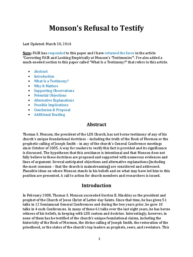 Last Updated: March 30, 2014 Note: FAIR has responded to this paper and I have returned the favor in the article Correcting FAIR and Looking Empirically at Monsons Testimonies. Ive also added a much-needed section to this paper called What Is a Testimony? that refers to this article. Abstract Introduction What Is a Testimony? Why It Matters Supporting Observations Potential Objections Alternative Explanations Possible Implications Conclusion & Proposal Additional Reading