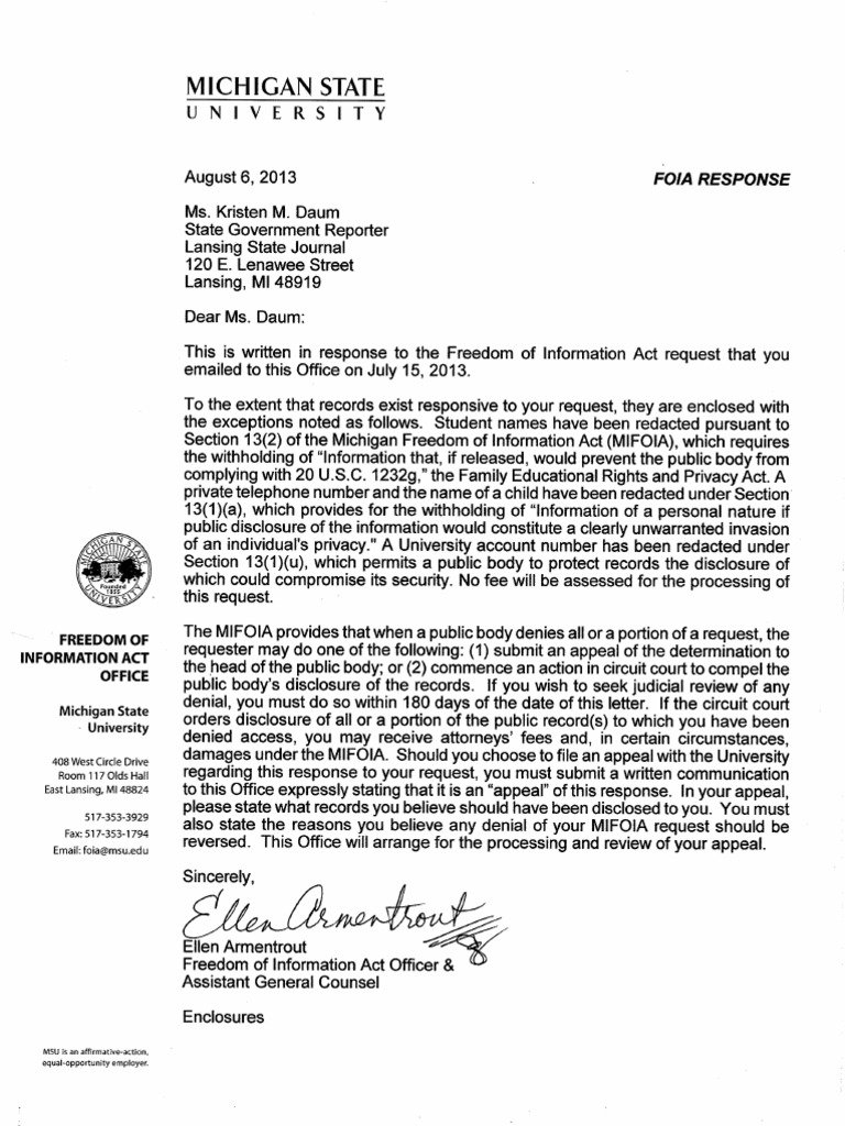 Michigan State University finance officials sent a letter and nearly 200 pages of billing invoices, receipts and cancelled checks to the Federal Aviation Administration last month, to assist the FAA in its investigation how the Michigan Department of Transportation uses of the state-owned planes. These documents come as a result of a Freedom of Information Act request by the Lansing State Journal.