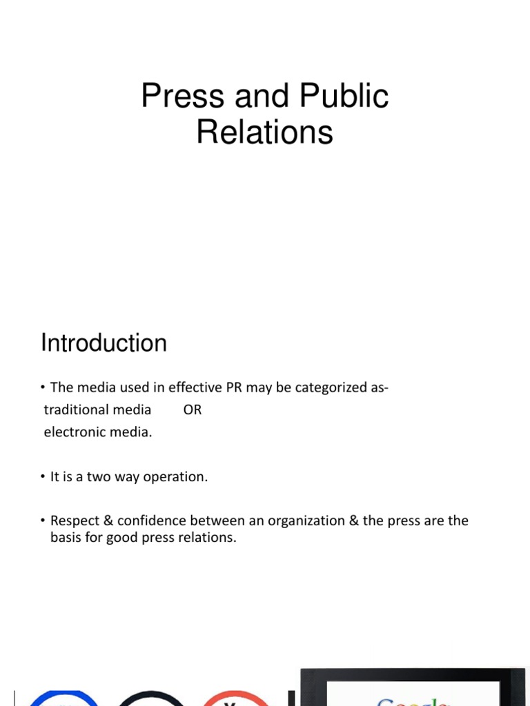 The media used in effective PR may be categorized astraditional media OR electronic media. It is a two way operation. Respect & confidence between an organization & the press are the basis for good press relations.