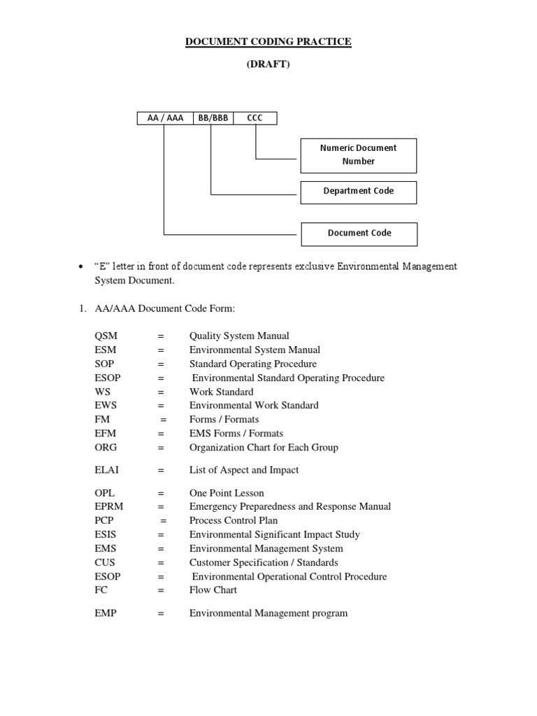 1. AA/AAA Document Code Form: QSM ESM SOP ESOP WS EWS FM EFM ORG ELAI OPL EPRM PCP ESIS EMS CUS ESOP FC EMP = = = = = = = = = = = = = = = = = = = Quality System Manual Environmental System Manual Standard Operating Procedure Environmental Standard Operating Procedure Work Standard Environmental Work Standard Forms / Formats EMS Forms / Formats Organization Chart for Each Group List of Aspect and Impact One Point Lesson Emergency Preparedness and Response Manual Process Control Plan Environmental Significant Impact Study Environmental Management System Customer Specification / Standards Environmental Operational Control Procedure Flow Chart Environmental Management program