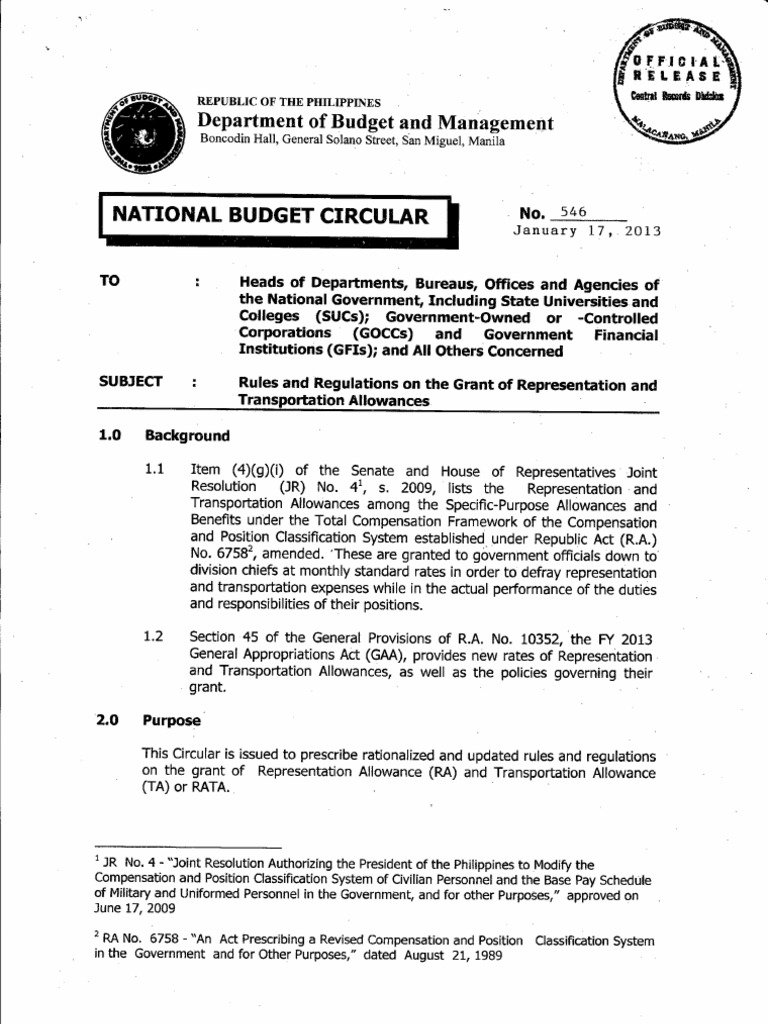 This Circular is issued to prescribe rationalized and updated rules and regulations on the grant of Representation Allowance (RA) and Transportation Allowance (TA) or RATA.