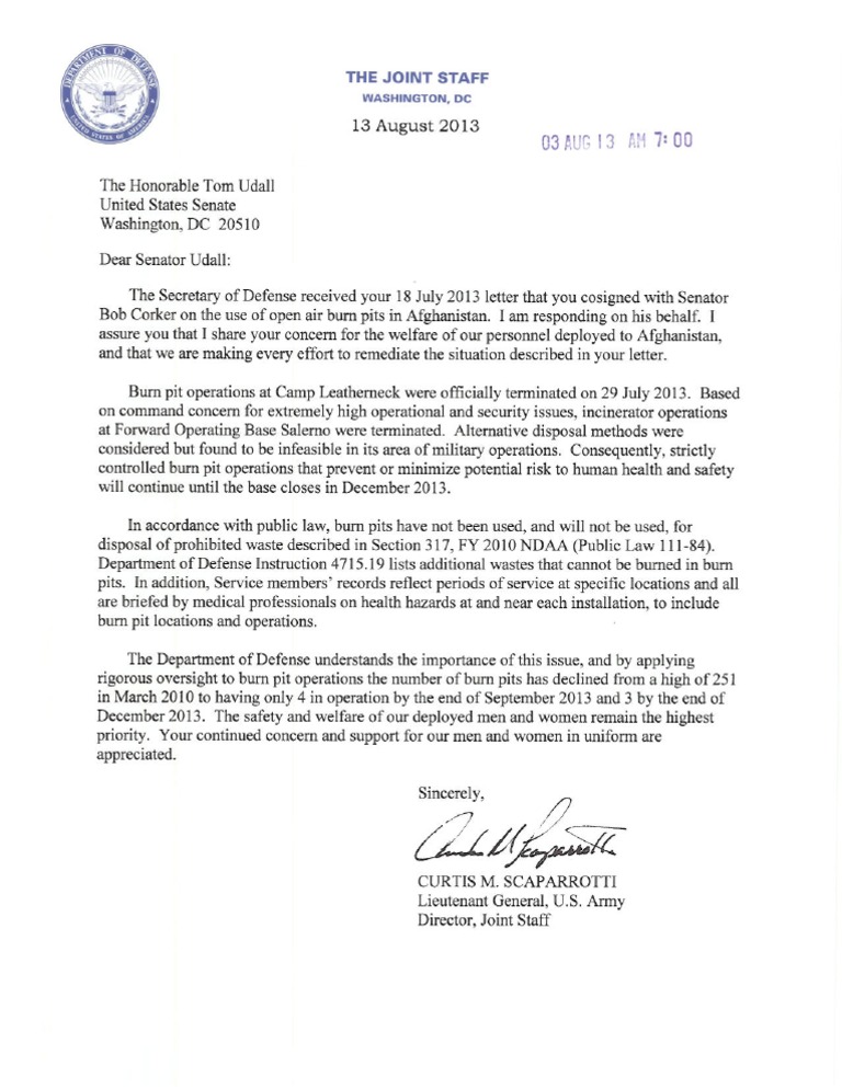 Lieutenant General Curtis Scaparrotti, director of the Joint Staff, responds to a letter from U.S. Senators Tom Udall (D-N.M.) and Bob Corker R-Tenn.) on the use of open-air burn pits at two camp sites supporting Operating Enduring Freedom in Afghanistan.