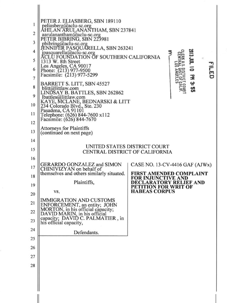 1. This case challenges Immigration and Customs Enforcement’s (“ICE”) practice of issuing immigration holds, also known as immigration detainers, toindividuals in the custody of federal, state, and local law enforcement agencies(“LEA”) without probable cause to believe the individuals are removable inviolation of the Fourth Amendment. This Court has subject matter jurisdictionunder 28 U.S.C. § 1331 and Article III of the U.S. Constitution. It has authority togrant declaratory relief under 28 U.S.C. §§ 2201 and 2202, and injunctive relief under 5 U.S.C. § 702. Alternatively, this Court has subject matter jurisdictionunder 28 U.S.C. § 2241, as the issuance of an immigration hold places Plaintiffs inthe concurrent custody of ICE. Venue is proper under 28 U.S.C. § 1391(b)(2).