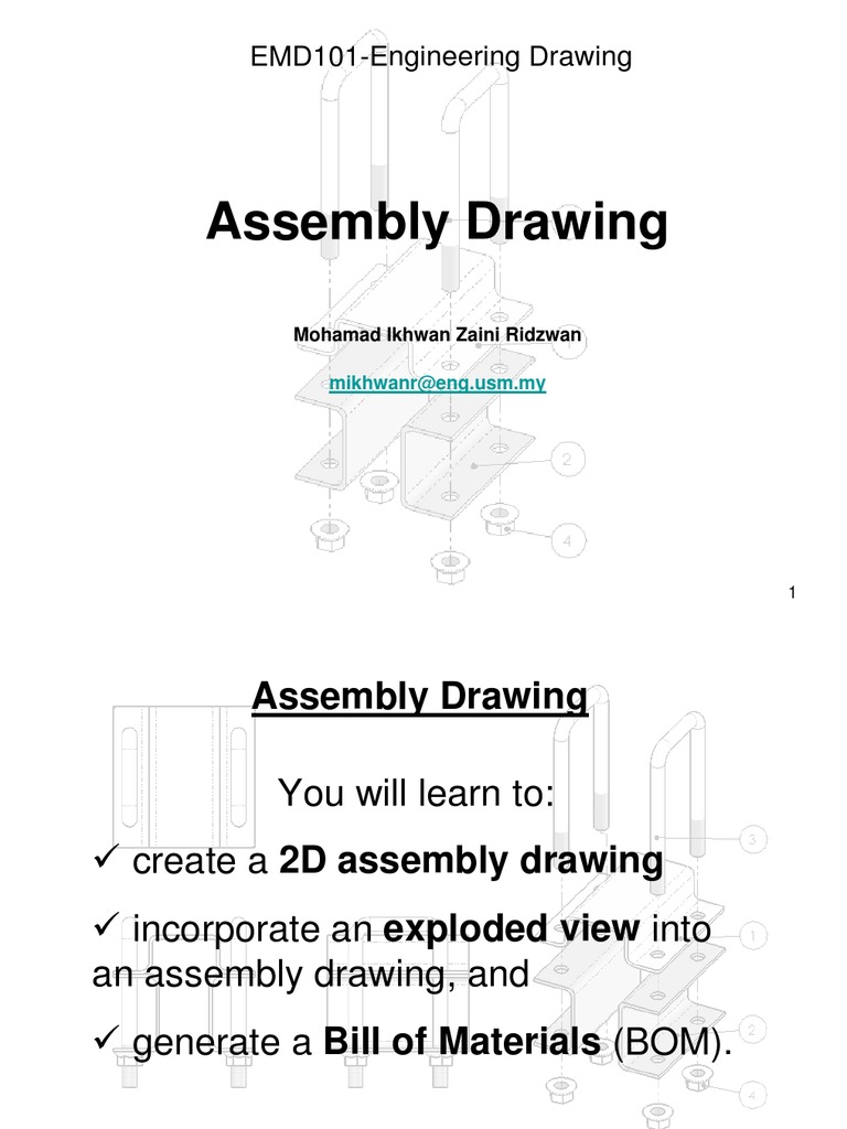 Assembly Drawing You will learn to: 9 create a 2D assembly drawing 9 incorporate an exploded view into an assembly drawing, and 9 generate a Bill of Materials (BOM).