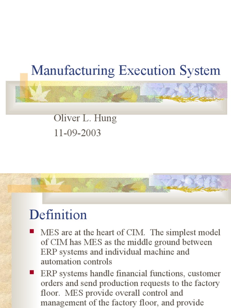 MES are at the heart of CIM. The simplest model of CIM has MES as the middle ground between ERP systems and individual machine and automation controls ERP systems handle financial functions, customer orders and send production requests to the factory floor. MES provide overall control and management of the factory floor, and provide updated information the ERP. (Semiconductor International 1997)