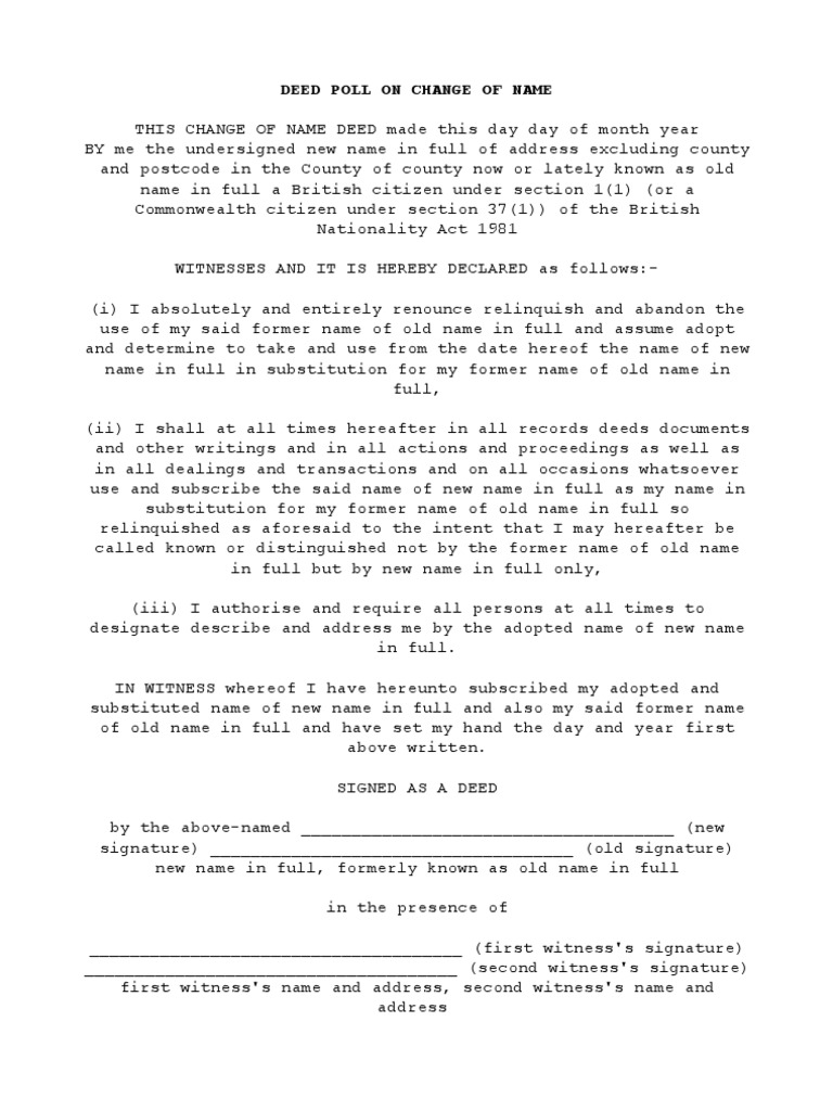 undersigned new name in full of address excluding county and postcode in the County of county now or lately known as old name in full a British citizen under section 1(1) (or a Commonwealth citizen under section 37(1)) of the British Nationality Act 1981 WITNESSES AND IT IS HEREBY DECLARED as follows:(i) I absolutely and entirely renounce relinquish and abandon the use of my said former name of old name in full and assume adopt and determine to take and use from the date hereof the name of new name in full in substitution for my former name of old name in full, (ii) I shall at all times hereafter in all records deeds documents and other writings and in all actions and proceedings as well as in all dealings and transactions and on all occasions whatsoever use and subscribe the said name of new name in full as my name in substitution for my former name of old name in full so relinquished as aforesaid to the intent that I may hereafter be called known or distinguished not by the former name of old name in full but by new name in full only, (iii) I authorise and require all persons at all times to designate describe and address me by the adopted name of new name in full. IN WITNESS whereof I have hereunto subscribed my adopted and substituted name of new name in full and also my said former name of old name in full and have set my hand the day and year first above written. SIGNED AS A DEED by the above-named _____________________________________ (new signature) ____________________________________ (old signature) new name in full, formerly known as old name in full in the presence of _____________________________________ (first witness's signature) _____________________________________ (second witness's signature) first witness's name and address, second witness's name and address