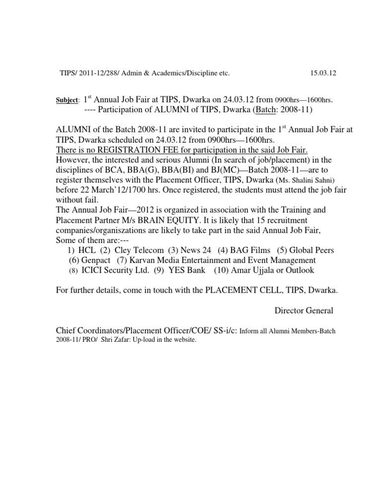 ALUMNI of the Batch 2008-11 are invited to participate in the 1st Annual Job Fair at TIPS, Dwarka scheduled on 24.03.12 from 0900hrs1600hrs. There is no REGISTRATION FEE for participation in the said Job Fair. However, the interested and serious Alumni (In search of job/placement) in the disciplines of BCA, BBA(G), BBA(BI) and BJ(MC)Batch 2008-11are to register themselves with the Placement Officer, TIPS, Dwarka (Ms. Shalini Sahni) before 22 March12/1700 hrs. Once registered, the students must attend the job fair without fail. The Annual Job Fair2012 is organized in association with the Training and Placement Partner M/s BRAIN EQUITY. It is likely that 15 recruitment companies/organiszations are likely to take part in the said Annual Job Fair, Some of them are:--1) HCL (2) Cley Telecom (3) News 24 (4) BAG Films (5) Global Peers (6) Genpact (7) Karvan Media Entertainment and Event Management (8) ICICI Security Ltd. (9) YES Bank (10) Amar Ujjala or Outlook For further details, come in touch with the PLACEMENT CELL, TIPS, Dwarka. Director General Chief Coordinators/Placement Officer/COE/ SS-i/c: Inform all Alumni Members-Batch