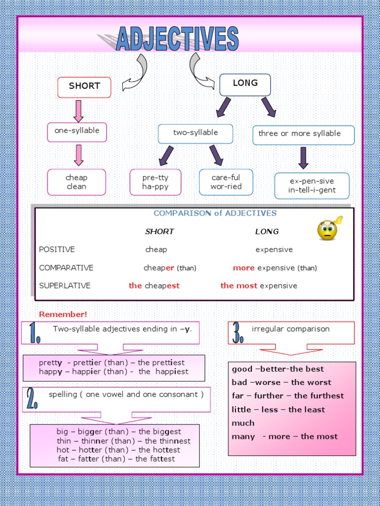 COMPARISON of ADJECTIVES SHORT POSITIVE COMPARATIVE SUPERLATIVE cheap cheaper (than) the cheapest LONG expensive more expensive (than) the most expensive