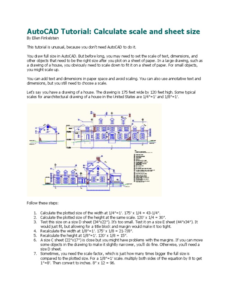 By Ellen Finkelstein This tutorial is unusual, because you dont need AutoCAD to do it. You draw full size in AutoCAD. But before long, you may need to set the scale of text, dimensions, and other objects that need to be the right size after you plot on a sheet of paper. In a large drawing, such as a drawing of a house, you obviously need to scale down to fit it on a sheet of paper. For small objects, you might scale up. You can add text and dimensions in paper space and avoid scaling. You can also use annotative text and dimensions, but you still need to choose a scale. Lets say you have a drawing of a house. The drawing is 175 feet wide by 120 feet high. Some typical scales for anarchitectural drawing of a house in the United States are 1/4=1 and 1/8=1.