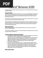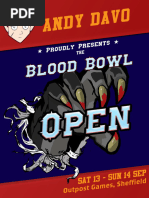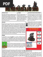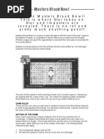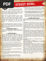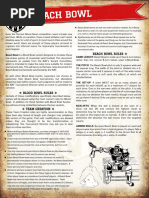 Dice removed after used. p28 Models - may not enter hex with another model. p14 SETUP p29 Front Arc - anything in front half of standing model. p11 Give each player Fan Support Card (Visitor or Home) Threat Hexes - 3 hexes in front of standing model. p11 Shuffle cards and place face down with event (?) counter near. Subs Bench - store extra players. players block if in entrance hex. p15 Deal starting cards. May discard any / all for replacements. Sin Bin - injured/fouling players stored for # of turns out of play. p15 Place Score counter at 0, Rush at 1 and Referee on checkered hex. Selecting a Random Player - Identify eligible players & draw card. p49 Coaches get 5 Team Action Tokens and Dice of their color Use 1st matching player # on right. Mark w/(?) if [Link] Event, resolve Home then Visitor team places 6 models anywhere on their half of board. Push Back - Winner moves player into 1 of 3 hexes away from pusher. p36 Remaining models in Subs Bench. If all 3 hexes have models already, player does not move. Ball launched onto pitch, Home team goes first. Event Cards - Stay active until another event (except Ball Shatters). p48 If drawn as action, may play at any time (after current action). RUSH SEQUENCE p32 If drawn for Fan Check, Ref Move, or Random Player, event after. Start of Rush - move rush marker (14 turns) & Launch ball if it's not in play Move / Pushed onto Ball - try pick up if standing & able or ball scatters p42 Launching the Ball - from Rushing coachs left board side, roll die: p30 On 1-5: place on DB hex that # of spaces from side. LEAGUE PLAY On 6: ricochets off opposite wall (roll die) 1-3:to Rushing coach, 4-6:away Games - may play 1 for league points per round. Any # for XP / $. p52 If ball hits player, works like hitting player in Scattering the Ball Pick Opponents - lowest players on league table pick first. If Rushing team fails Catch, Rush Ends. League Table - by Ranking ($), Points (W/L), Strike Difference. p55 Take Actions - 5 team actions (track w/tokens) + special action cards p33 Underdog - $ for MVP/Free Agent, = difference in team rankings. p54 Each player max: 2 team, 1 special, unlimited Free After MVP auction, for every 10mc left, roll on Free Agent Table. Rush Ends When - run out of team actions / cards or players. 1=Human Jack 3=Human Striker 5=Forge Father Guard Throw Strike or at opposing player or Keeper Punts 2=Human Guard 4=Veer-Myn Striker 6=Orx Guard Drop the ball (fail pick up/catch or fall over with ball) Free Agents - may take any/all rolled. No XP, roster limit applies. Rush does not end if you catch scatter from any above action. Between Match Sequence p56 End of Rush - move your out of play(Sin Bin) players 1 step to Subs Bench 1. Man of the Match - Team (both on tie) w/ most Fans: random player who Move Ref = # spaces <= # in upper left of a drawn card. May not end played and is alive gain 1 XP. No award if game was tie. p56 move in colored space or move onto ball. If Event, resolve. p49 2. Results - W:2pts, L/T:1pt. Score 7=W:3/L:0, Note Strike difference. p57 3. Player Advancement - Mark as occurs in game. p57-58 SCATTERING THE BALL p31 Gain 1 XP - Scoring 3/4 strike, Injuring 3+ hits, Man of the Match. Declare which direction is 1. Roll die for direction and distance. Advance - spend XP = to next rank (player max 1 rank / game). If ball hits standing player from front arc, must attempt Catch if able Player value +5mc / rank. (0 success Throw). If not able or fail, ball scatters. Roll on Table - matching role or spend coach die for coach table. Double on Catch allows free Run/Throw, even Non-Rushing team. Table Maxed - choose another role table. Knocked down players dont block ball, but scatter if stops on top. Invalid Result - choose another from same table. Hitting the Wall - Ball bounces off the wall at a 60 degree angle. p14 Max Game Value - 3+ & max 1 gain per. (Strength, Speed, Skill) If the ball hits the wall in one of the 6 hexes with 3 sides touching the Abilities - may not have same Ability more than once. outside of the board, it bounces straight back. SCORING AND WINNING Strike / Scoring - Throw Strike within strike zone hex to its strike hex. p13 1 point for closest 2 zones, 3 points for farthest zone. p14 Bonus +1 point if scores from farthest hex in zone. p14 Adjust score track up or down. p16 Winning - If any player gets 7+ points, they win instantly. p16 After 14 turns, highest score wins. If tie, go to Sudden Death. Sudden Death - Reset rush counter, first team to score wins. No new players may come on field. Team also wins if opponent has no Throwers. Draw if both have none. EXHIBITION MATCHES p50 Agree on team budget. Starter team (100mc) + extra Spend extra on MVPs bidding / advancements (5mc / table roll) May also agree to spend money on extra players.