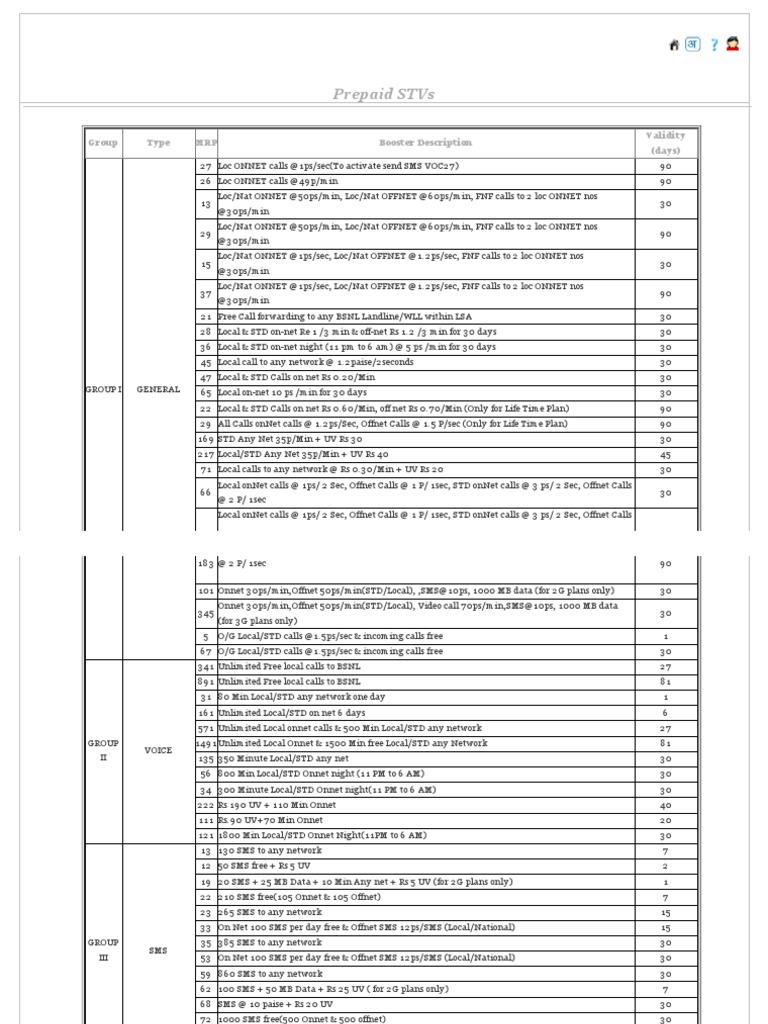 6 7 O/G Local/STD calls @1 .5ps/sec & incom ing calls free 3 4 1 Unlim ited Free local calls to BSNL 89 1 Unlim ited Free local calls to BSNL 3 1 80 Min Local/STD any network one day 1 6 1 Unlim ited Local/STD on net 6 day s 57 1 Unlim ited Local onnet calls & 500 Min Local/STD any network GROUP II VOICE 1 4 9 1 Unlim ited Local Onnet & 1 500 Min free Local/STD any Network 1 3 5 3 50 Minute Local/STD any net 56 800 Min Local/STD Onnet night (1 1 PM to 6 AM) 3 4 3 00 Minute Local/STD Onnet night(1 1 PM to 6 AM) 2 2 2 Rs 1 9 0 UV + 1 1 0 Min Onnet 1 1 1 Rs.9 0 UV+ 7 0 Min Onnet 1 2 1 1 800 Min Local/STD Onnet Night(1 1 PM to 6 AM) 1 3 1 3 0 SMS to any network 1 2 50 SMS free + Rs 5 UV 1 9 2 0 SMS + 2 5 MB Data + 1 0 Min Any net + Rs 5 UV (for 2 G plans only ) 2 2 2 1 0 SMS free(1 05 Onnet & 1 05 Offnet) 2 3 2 6 5 SMS to any network 3 3 On Net 1 00 SMS per day free & Offnet SMS 1 2 ps/SMS (Local/National) GROUP III SMS 3 5 3 85 SMS to any network 53 On Net 1 00 SMS per day free & Offnet SMS 1 2 ps/SMS (Local/National) 59 86 0 SMS to any network 6 2 1 00 SMS + 50 MB Data + Rs 2 5 UV ( for 2 G plans only ) 6 8 SMS @ 1 0 paise + Rs 2 0 UV 7 2 1 000 SMS free(500 Onnet & 500 offnet) 83 1 6 50 SMS to any network 1 4 7 3 000 SMS to any network 1 4 1 00 MB