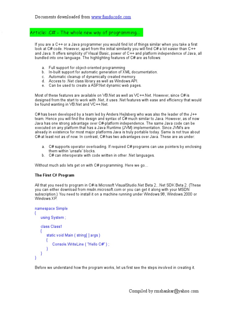 Documents downloaded from www.funducode.com Article: .C# - The whole new way of programming...