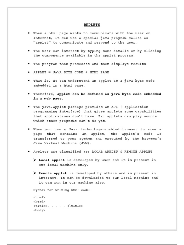 When a html page wants to communicate with the user on Internet, it can use a special java program called as applet to communicate and respond to the user. The user can interact by typing some details or by clicking the components available in the applet program. The program then processes and then displays results. APPLET = JAVA BYTE CODE + HTML PAGE That is, we can understand an applet as a java byte code embedded in a html page. Therefore, applet can be defined as java byte code embedded in a web page. The java.applet package provides an API ( application programming interface) that gives applets some capabilities that applications dont have. Ex: applets can play sounds which other programs cant do yet. When you use a Java technology-enabled browser to view a page that contains an applet, the applet's code is transferred to your system and executed by the browser's Java Virtual Machine (JVM). Applets are classified as: LOCAL APPLET & REMOTE APPLET Local applet is developed by user and it is present in our local machine only. Remote applet is developed by others and is present in internet. It can be downloaded to our local machine and it can run in our machine also.