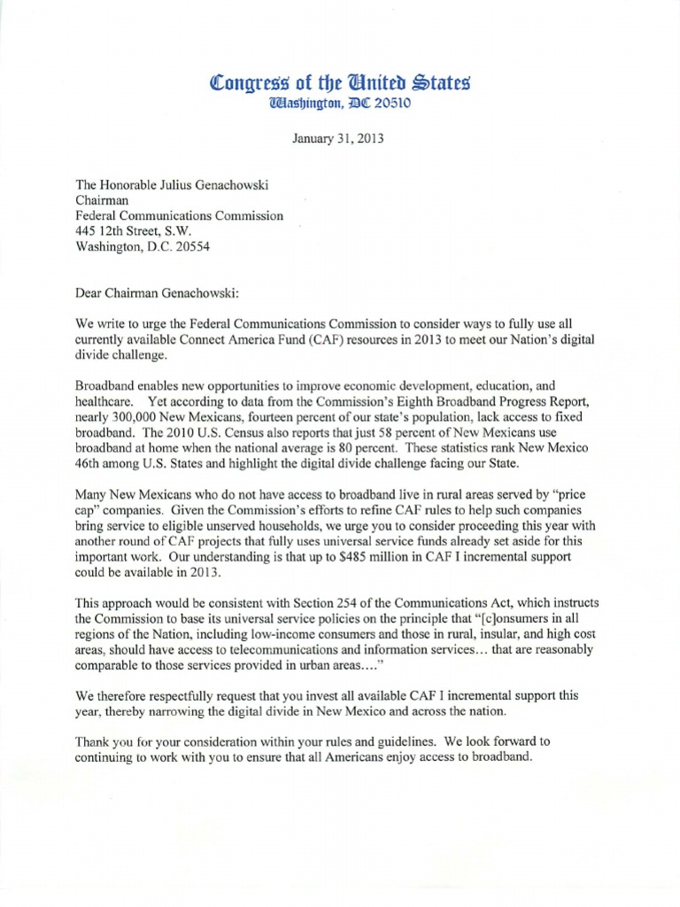 In January 2013, U.S. Senator Tom Udall and members of the NM delegation sent a letter to FCC Chairman Genachowski urging the FCC to use all available Connect America Fund resoures towards expanding broadband access.