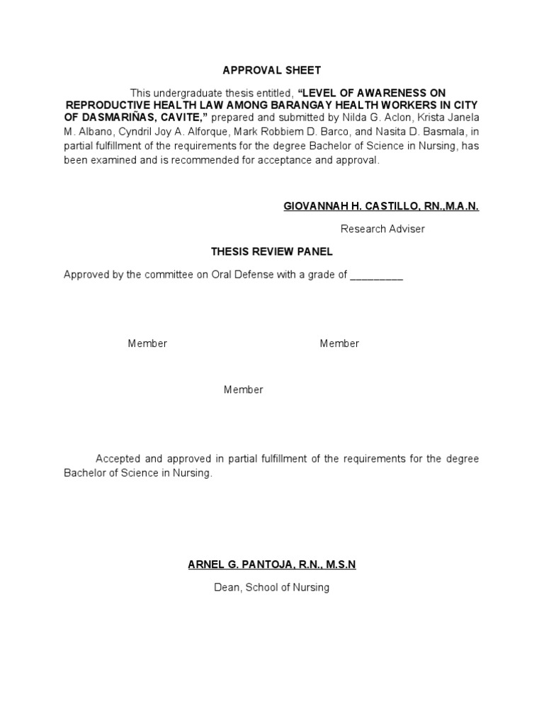 APPROVAL SHEET This undergraduate thesis entitled, LEVEL OF AWARENESS ON REPRODUCTIVE HEALTH LAW AMONG BARANGAY HEALTH WORKERS
