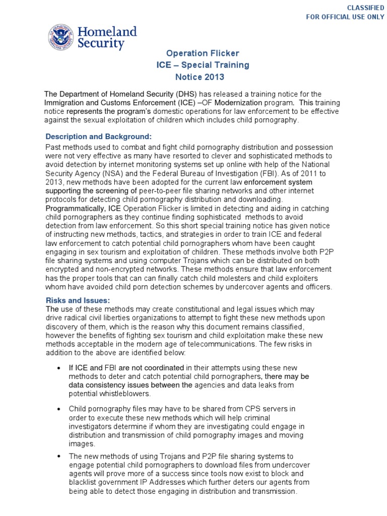 Trojan Strategy: The Trojans shall be developed by our IT technicians and programming teams coordinated between the FBI Cyber Crime division and ICE. The purpose of these programs is to infect anyone whom is added to our suspected child-pornographer lists then use them to download child pornography then distriute them with other users on P2P file sharing networks to be able to flag the IP Address then sent it to the National Center for Missing and Exploited Children (NCMEC). The Trojans will use the following procedures to engage in the catching of suspects. ICE will work closely with the FBI to develop Trojans that specifically can patch into all standard P2P protocols icnluding ed2k, gnutella, Kad, Bittorrent, and any other similar protocols concerning the distribution and trading of files. The Trojans used will be mainly Windows based and will be difficult to end the task and remove using a task manager or any conventional methods of process termination. The Trojans will store the child pornography in folders of which the average user is not aware of or has no expertise of. The files shared will be files which were already flagged by the NCMEC for this method to be effective. P2P file sharing strategy: ICE's new method to catch child predators using P2P file sharing software is by sharing files which will not be found under the suspects radar. Sharing files using terms such as PTHC, PTSC, R@ygold, hussyfan, 12yo, 11yo, etc. and other terms has proven more difficult as pedophiles have become aware of the sting operations using these keywords. This method has been adopted and has been used for already two years and has so far had success with gaining approval after submitting key documents of these procedures. The procedure will be using the new methods which include stuffing child pornography images and moving-images inside of average files which will be shared by servers sanctioned by the FBI. The methods of stuffing will vary from each agent or officer but are approved as long as the suspect cannot detect that the file contains child pornography until the file has been downloaded. Child pornography has successfully been stuffed into adult pornography films, music files using ID3 tags, software programs, keygens and cracks, and other material that has been illicitly traded over P2P file sharing networks. This method has been successful at deterring both child pornographers and copyright infringement and has been approved for official procedures under the guise that it be kept as classified information. Stuffing has prevented child pornographers from being able to avoid our detection systems and have been used to finally net difficult child pornography distributors and downloaders.