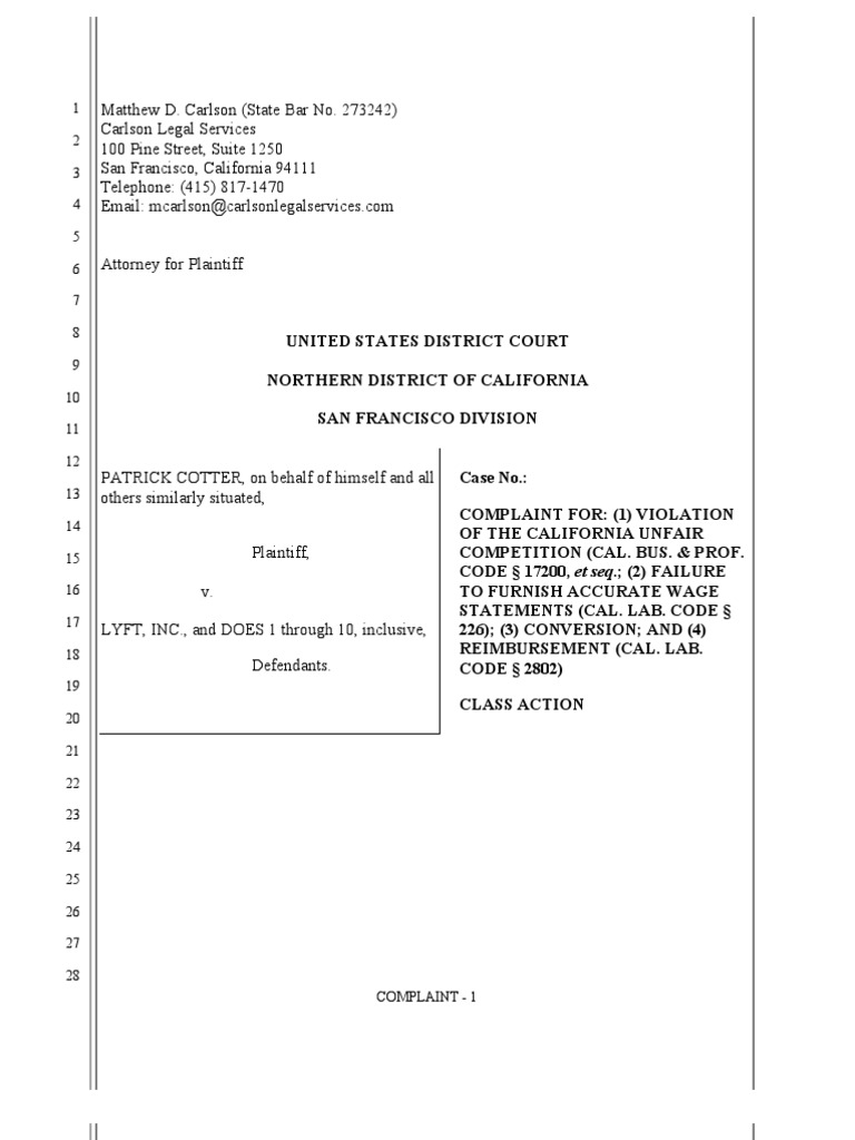 Plaintiff Patrick Cotter (hereafter “Plaintiff”), by and through his attorney, brings thisaction on behalf of himself and all others similarly situated against Defendants Lyft, Inc.(hereafter “Lyft”) and Does 1-10 (hereafter “Doe Defendants”) (collectively, “Defendants”).