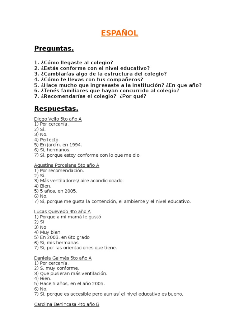 1. I came into the school because my older sister came a couple of years before me. That’s why my parents decided to send me to this school 2. I’m satisfied with the majorities of the subjets, although some of them maybe need another approach. 3. No, I wouldn’t. 4. With my classmates luckily I get on very well, they have all very good wave, and that makes it easier the day after day in the course 5. In 2006, in 1st grade. 6. Yes, my Sister. 7. I would recommend the school because it has a very good level.