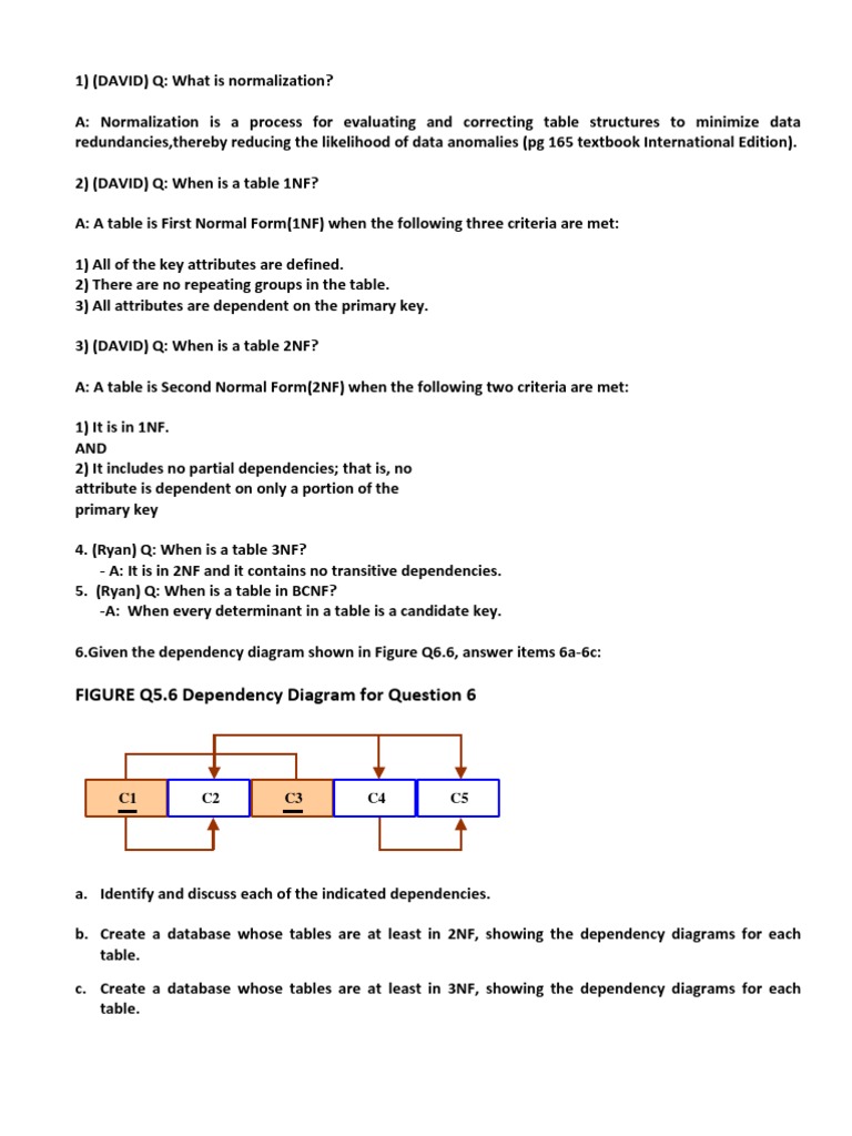 A: Normalization is a process for evaluating and correcting table structures to minimize data redundancies,thereby reducing the likelihood of data anomalies (pg 165 textbook International Edition). 2) (DAVID) Q: When is a table 1NF? A: A table is First Normal Form(1NF) when the following three criteria are met: 1) All of the key attributes are defined. 2) There are no repeating groups in the table. 3) All attributes are dependent on the primary key. 3) (DAVID) Q: When is a table 2NF? A: A table is Second Normal Form(2NF) when the following two criteria are met: 1) It is in 1NF. AND 2) It includes no partial dependencies; that is, no attribute is dependent on only a portion of the primary key 4. (Ryan) Q: When is a table 3NF? - A: It is in 2NF and it contains no transitive dependencies. 5. (Ryan) Q: When is a table in BCNF? -A: When every determinant in a table is a candidate key. 6.Given the dependency diagram shown in Figure Q6.6, answer items 6a-6c: