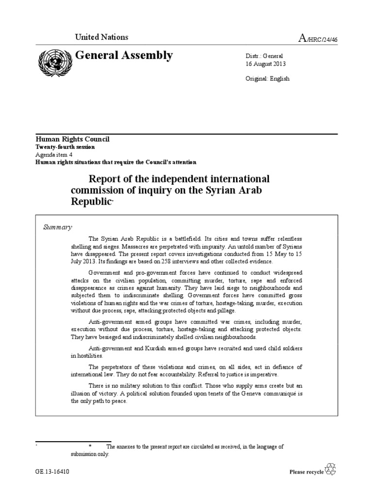 The Syrian Arab Republic is a battlefield. Its cities and towns suffer relentless shelling and sieges. Massacres are perpetrated with impunity. An untold number of Syrians have disappeared. The present report covers investigations conducted from 15 May to 15 July 2013. Its findings are based on 258 interviews and other collected evidence. Government and pro-government forces have continued to conduct widespread attacks on the civilian population, committing murder, torture, rape and enforced disappearance as crimes against humanity. They have laid siege to neighbourhoods and subjected them to indiscriminate shelling. Government forces have committed gross violations of human rights and the war crimes of torture, hostage-taking, murder, execution without due process, rape, attacking protected objects and pillage. Anti-government armed groups have committed war crimes, including murder, execution without due process, torture, hostage-taking and attacking protected objects. They have besieged and indiscriminately shelled civilian neighbourhoods. Anti-government and Kurdish armed groups have recruited and used child soldiers in hostilities. The perpetrators of these violations and crimes, on all sides, act in defiance of international law. They do not fear accountability. Referral to justice is imperative. There is no military solution to this conflict. Those who supply arms create but an illusion of victory. A political solution founded upon tenets of the Geneva communiqu is the only path to peace.