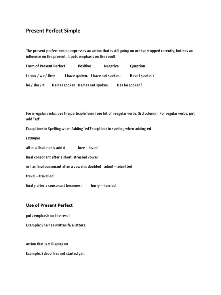 The present perfect simple expresses an action that is still going on or that stopped recently, but has an influence on the present. It puts emphasis on the result. Form of Present Perfect I / you / we / they he / she / it Positive Negative Question Have I spoken?