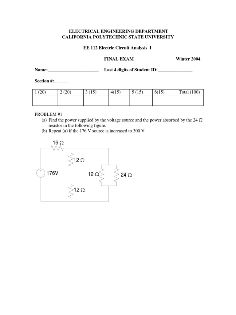 ELECTRICAL ENGINEERING DEPARTMENT CALIFORNIA POLYTECHNIC STATE UNIVERSITY EE 112 Electric Circuit Analysis I FINAL EXAM Name:______________________ Section