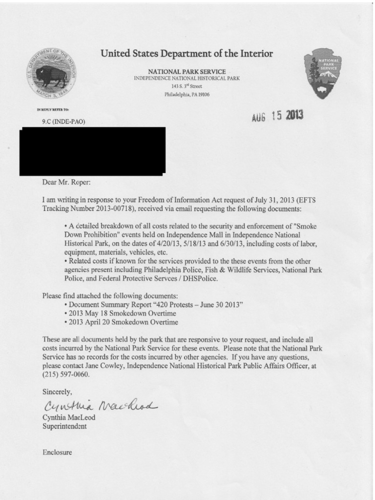 3 items from a response to a FOIA request by Ed Roper to the DOI regarding expenditures by the Park Service enforcing "Smokedown Prohibition" Protests at Independence Mall