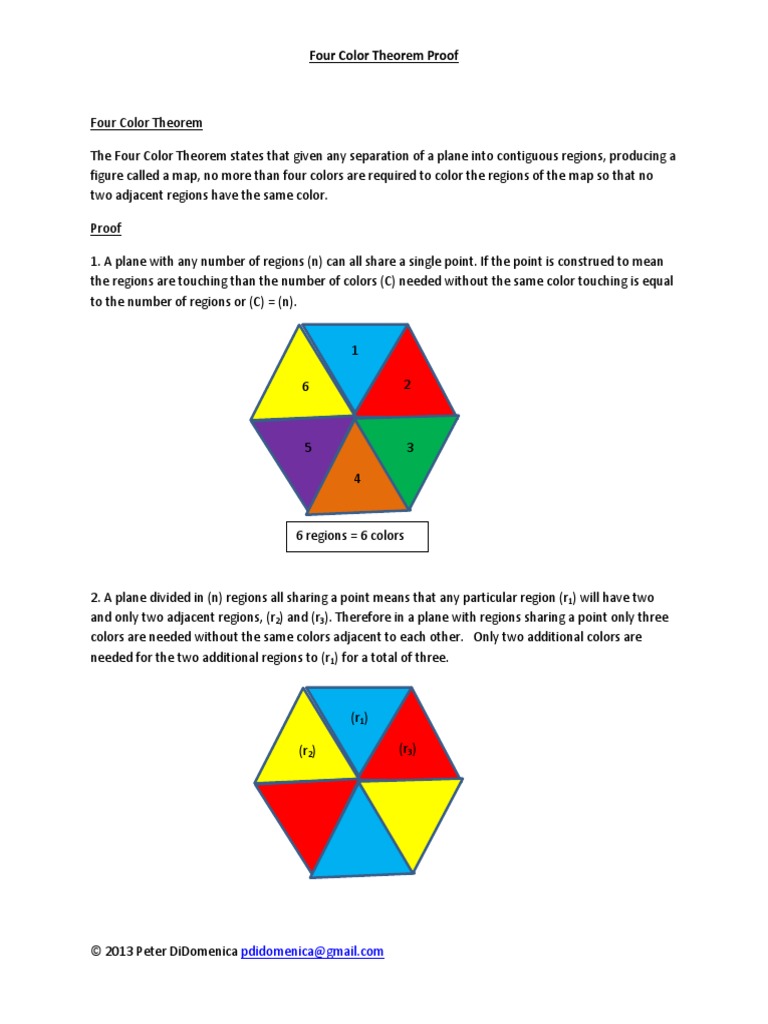 Four Color Theorem The Four Color Theorem states that given any separation of a plane into contiguous regions, producing a figure called a map, no more than four colors are required to color the regions of the map so that no two adjacent regions have the same color. Proof 1. A plane with any number of regions (n) can all share a single point. If the point is construed to mean the regions are touching than the number of colors (C) needed without the same color touching is equal to the number of regions or (C) = (n). 1 6 2