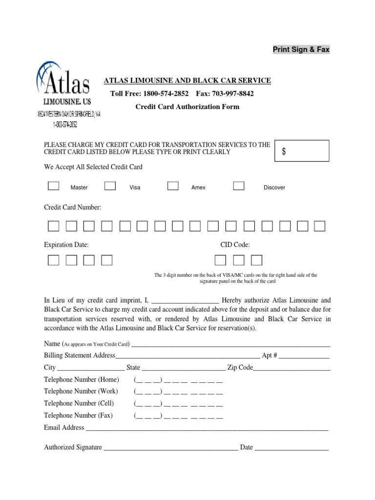 In Lieu of my credit card imprint, I, ____________________ Hereby authorize Atlas Limousine and