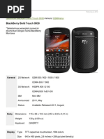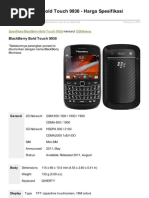 Data 3G: HSDPA; HSUPA EDGE: Class 10, 236.8 kbps GPRS: Class 10 (4+1/3+2 slots), 32 - 48 kbps WLAN: Tidak Bluetooth: Ya, v2.0 with A2DP Infrared: Tidak Cable/Port: Ya, microUSB v2.0 Kamera Primer(belakang): 3.15 MP, 2048x1536 pixels, autofocus, LED flash Sekunder(depan): Tidak Video Record: Ya Fitur Sistem Operasi(OS): BlackBerry OS Browser: HTML GPS: Ya, with A-GPS support, BlackBerry Maps Messaging: SMS, MMS, Email, IM Java: Ya Radio: Tidak Baterai Stand by: Up to 336 h Talk Time: Up to 5 h Tipe: Standard battery, Li-Ion 1400 mAh Fitur Tambahan Video Player: